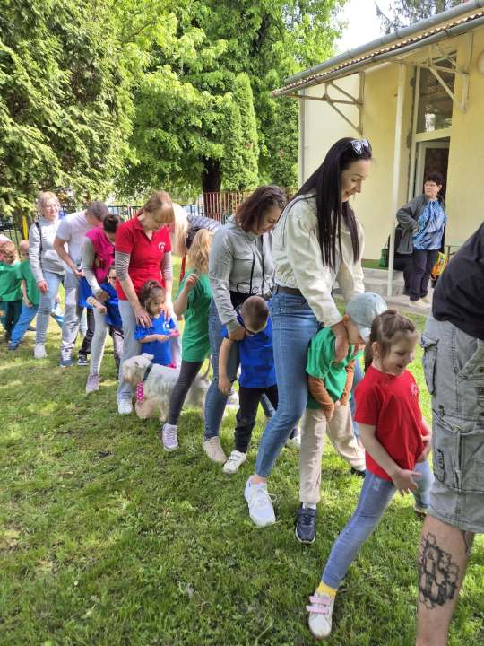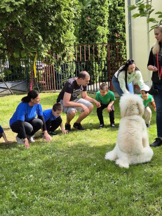 A bemelegítés után a gyerekek a szülőkkel közösen próbálhatták ki az elkészített akadálypályát és mozoghattak Miloval és Casperrel terápiás kutyáinkkal.