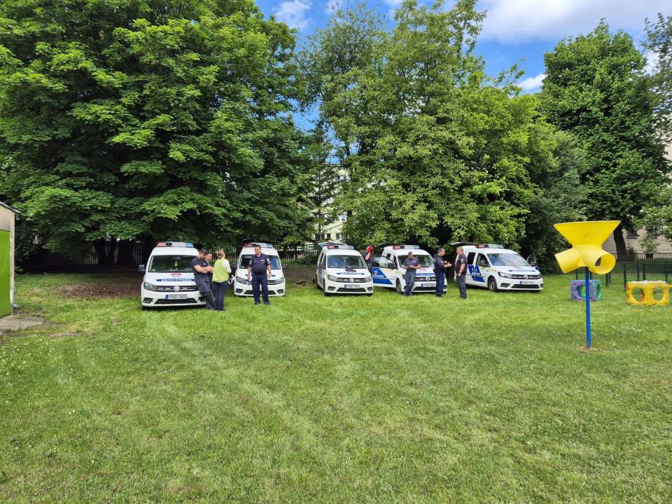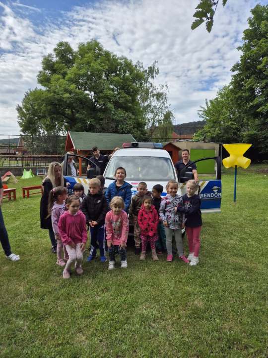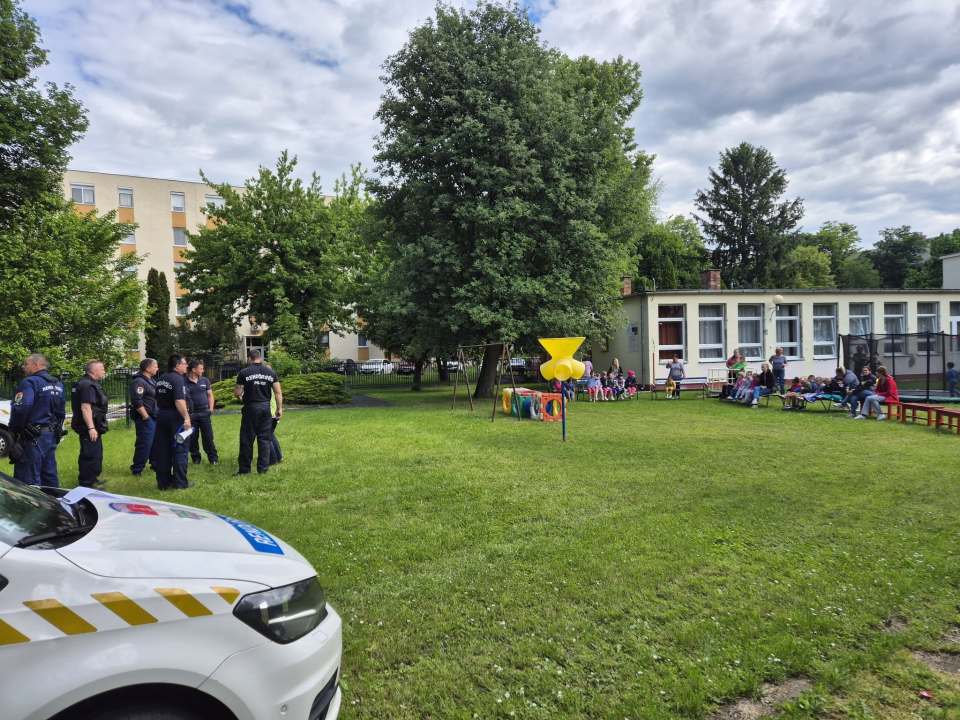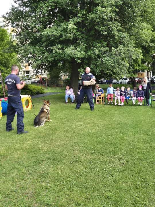 A vármegye rendőrkutyáinak külső helyszínen történő kiképzése alkalmából látogattak meg minket a rendőrök és hűséges társaik. A gyerekek megfelelő távolságból figyelhették meg a kutyák és kiképzőjük munkáját.